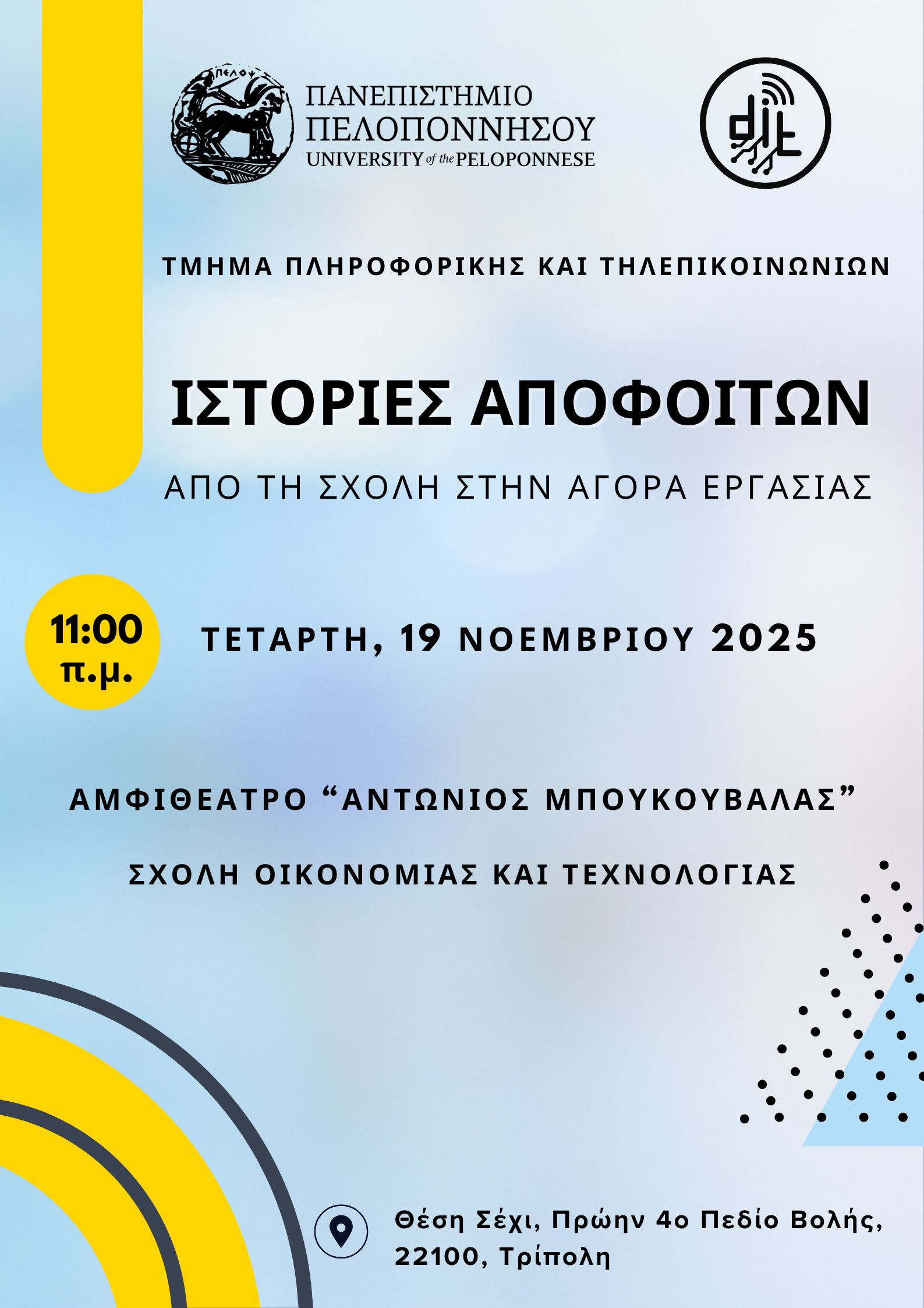 Ημερομηνία Δημοσίευσης:Το Τμήμα Πληροφορικής και Τηλεπικοινωνιών του Πανεπιστημίου Πελοποννήσου διοργανώνει ανοιχτή εκδήλωση με θέμα: