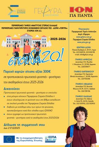 «Παροχή καρτών σίτισης σε προπτυχιακούς πρωτοετείς φοιτητές – φοιτήτριες του ακαδημαϊκού έτους 2025-2026, μέλη οικογενειών της Περιφέρειας Στερεάς Ελλάδας με οικογενειακό εισόδημα κάτω από το όριο της φτώχειας, προσαυξανόμενο κατά δύο χιλιάδες ευρώ (2.000,00€), με χορηγία της «ΙΟΝ Α.Ε. Βιομηχανίας & Εμπορίου Κακάο και Σοκολάτας».