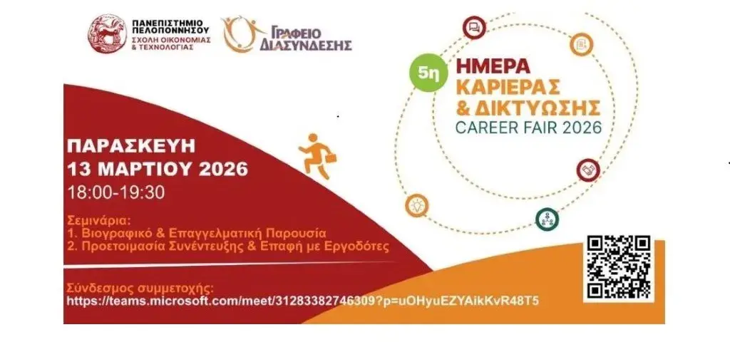 Στο πλαίσιο της 5ης Ημέρας Καριέρας της Σχολής Οικονομίας και Τεχνολογίας, το Γραφείο Διασύνδεσης του Πανεπιστημίου Πελοποννήσου διοργανώνει δύο εξ αποστάσεως σεμινάρια με στόχο την καλύτερη προετοιμασία των φοιτητών/αποφοίτων για την είσοδό τους στην αγορά εργασίας.