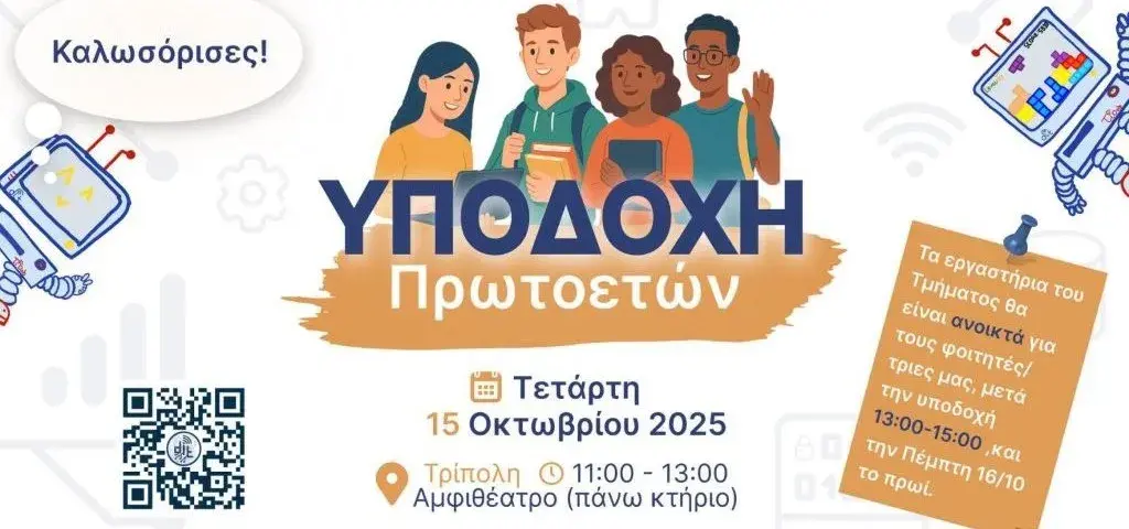 Image Το Τμήμα Πληροφορικής και Τηλεπικοινωνιών υποδέχεται τους/τις πρωτοετείς φοιτητές/τρίες του! Η παρουσίαση της εκδήλωσης είναι διαθέσιμη στο Υποδοχή Πρωτοετών Φοιτητών 2025-2026. Ενημερωμένο: 16 Οκτωβρίου 2025